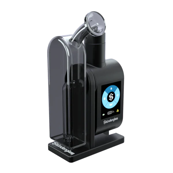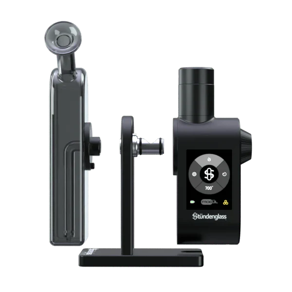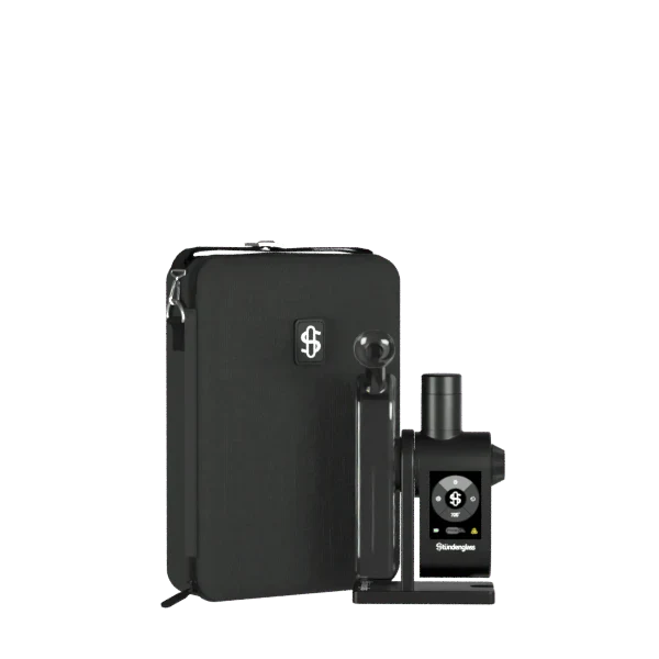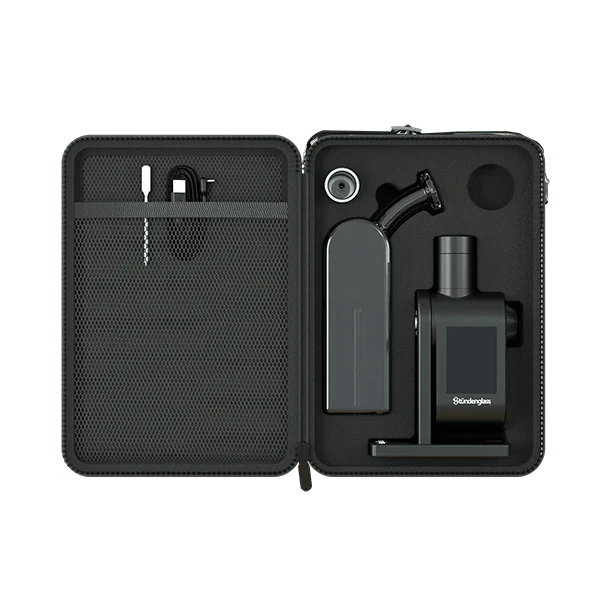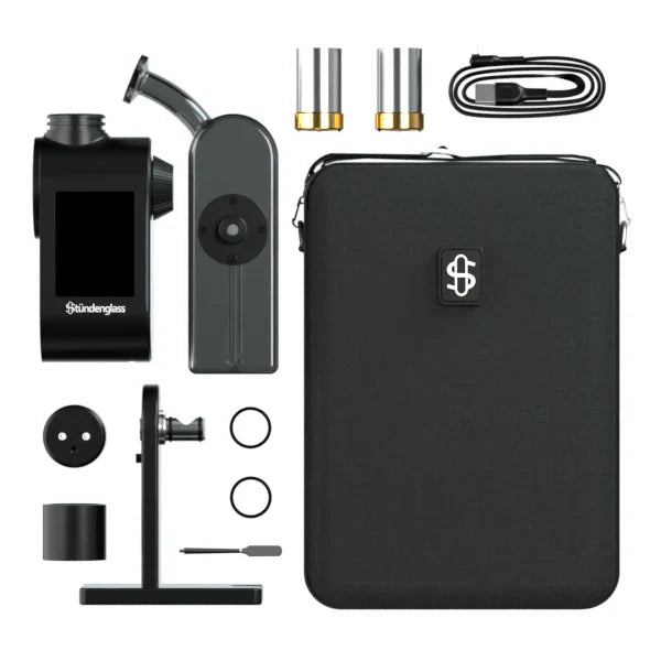 The Deluxe Travel set comes complete with a Modül, a Dok with clear glass, along with Modül Tanks for both dry materials and concentrates, all enclosed in a premium fabric, drop-resistant travel case.