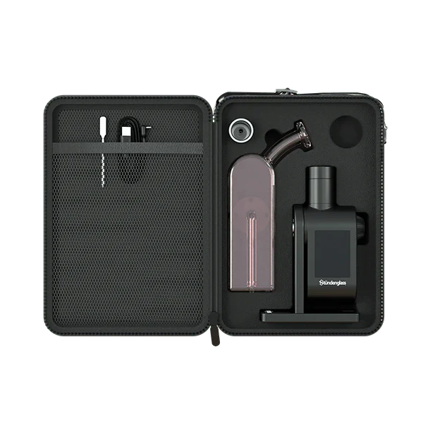 The Deluxe Travel set comes complete with a Modül, a Dok with clear glass, along with Modül Tanks for both dry materials and concentrates, all enclosed in a premium fabric, drop-resistant travel case.