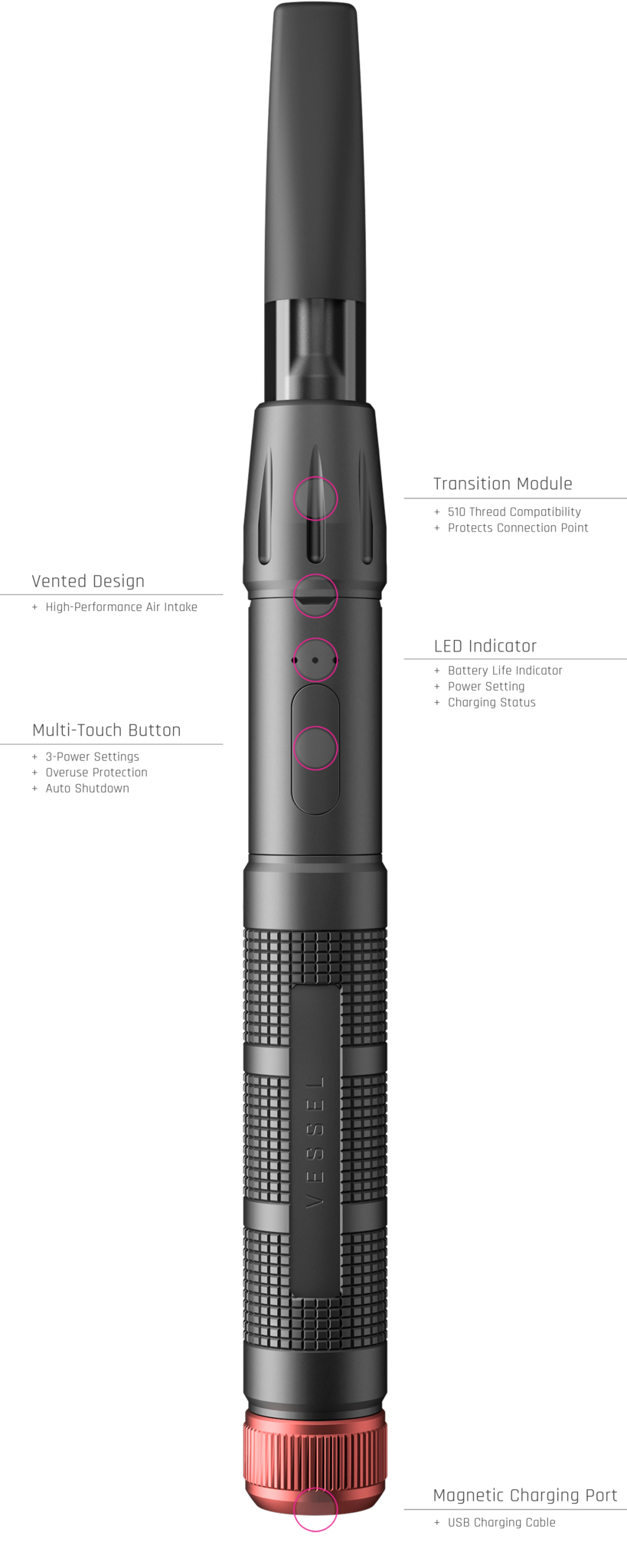 We adapted our design to fit your needs with little compromise. The integration of Vessel's magnetic charging port means threading and unthreading your 510 cartridge is a thing of the past. The little things matter to us, always.